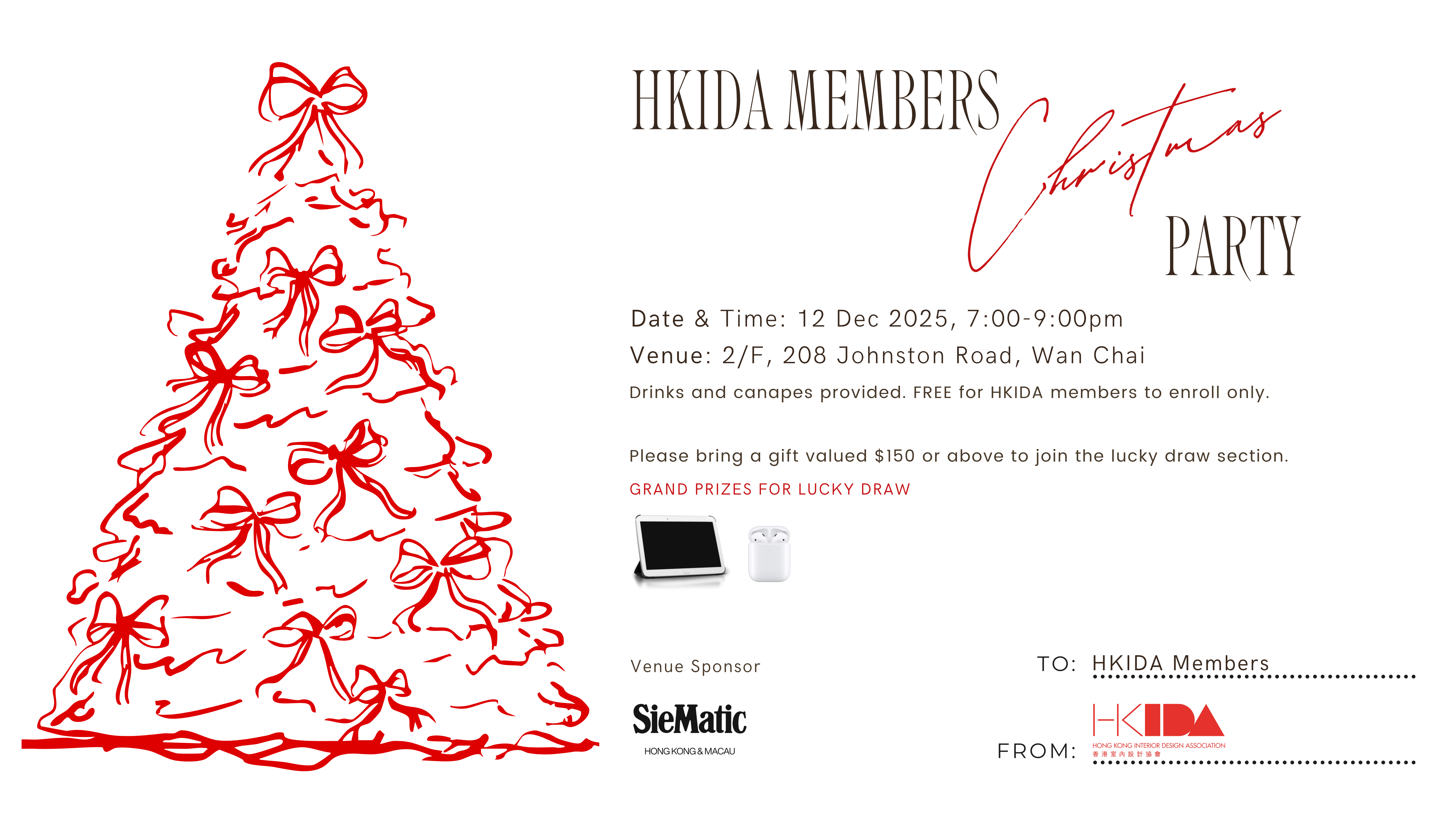 We are happy to announce that HKIDA is going to organize a Christmas Party for our members only this year. Members are encouraged to bring a gift valued $150 or above to join the lucky draw section. The event will be organized after Annual General Meeting, you are cordially invited to the AGM as well. Please find below the rundown and reserve your seat. Since there are limited seats available, the reservation is on first-come-first-serve basis and for HKIDA members only.
