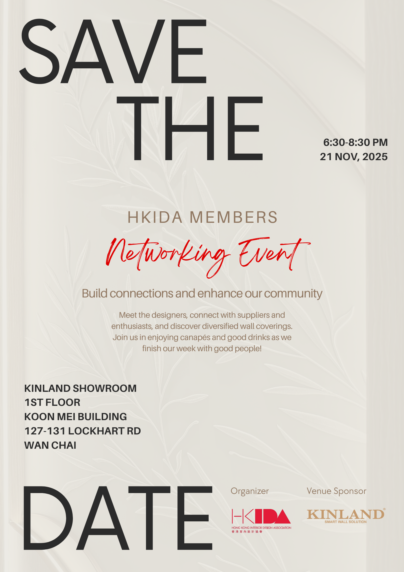HKIDA will host a Member Networking Event to invite HKIDA members to meet with designers, connect with suppliers and enthusiasts, and discover diversified wall coverings. Join us in enjoying canapés and good drinks as we finish our week with good people!