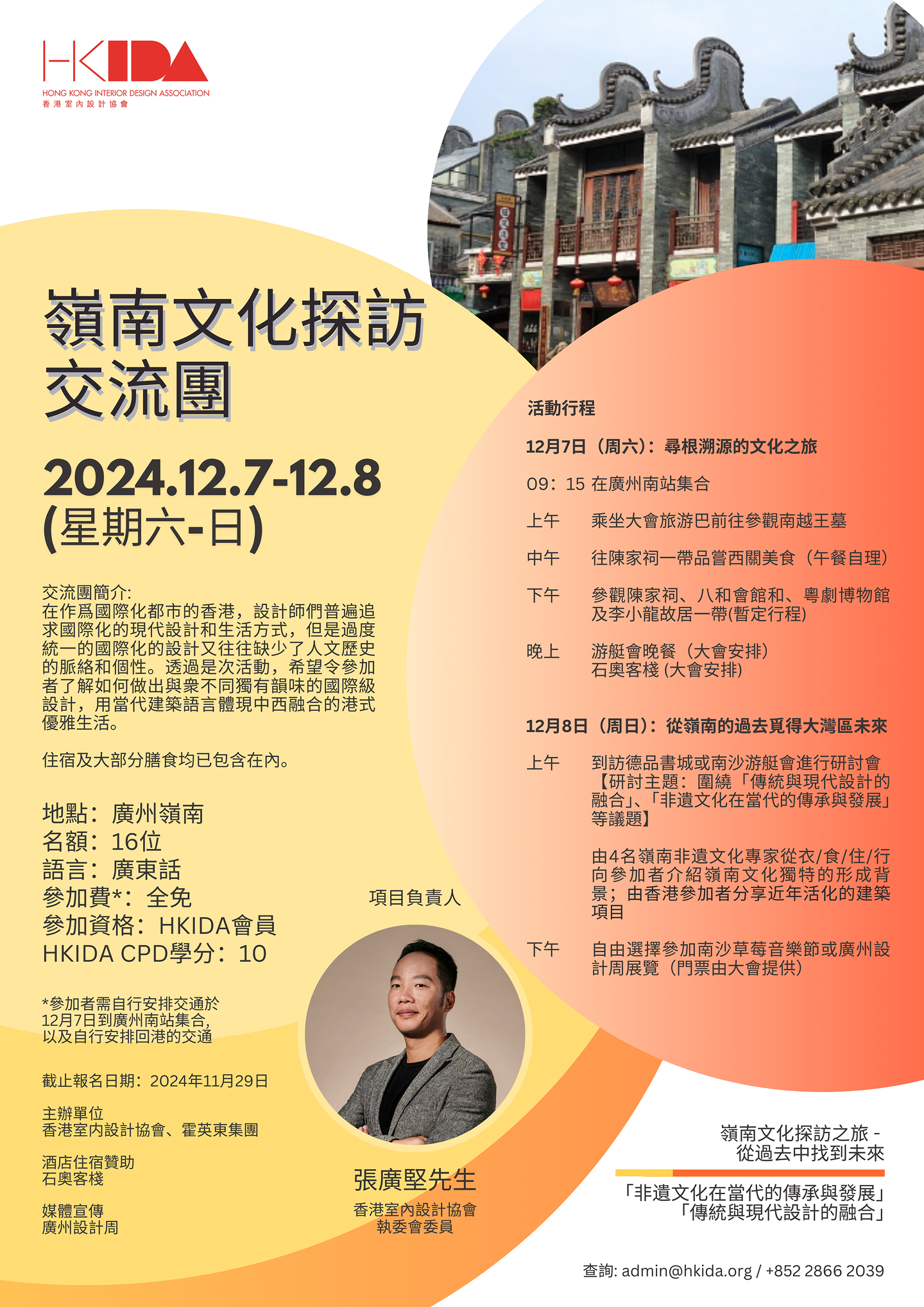 中國(廣州)國際家具博覽會(簡稱中國家博會)創辦于1998年,以“設計引領、內外循環、全鏈協同”爲定位展出全題材産品。中國家博會(廣州)每届彙聚超4700家海內外頂尖品牌企業,接待200多個國家和地區的38萬名專業觀衆。HKIDA為會員向大會成功爭取住宿、交通安排及大會專人接待安排行程,讓有興趣的香港室內設計師通過展覽了解和拓展內地市場。