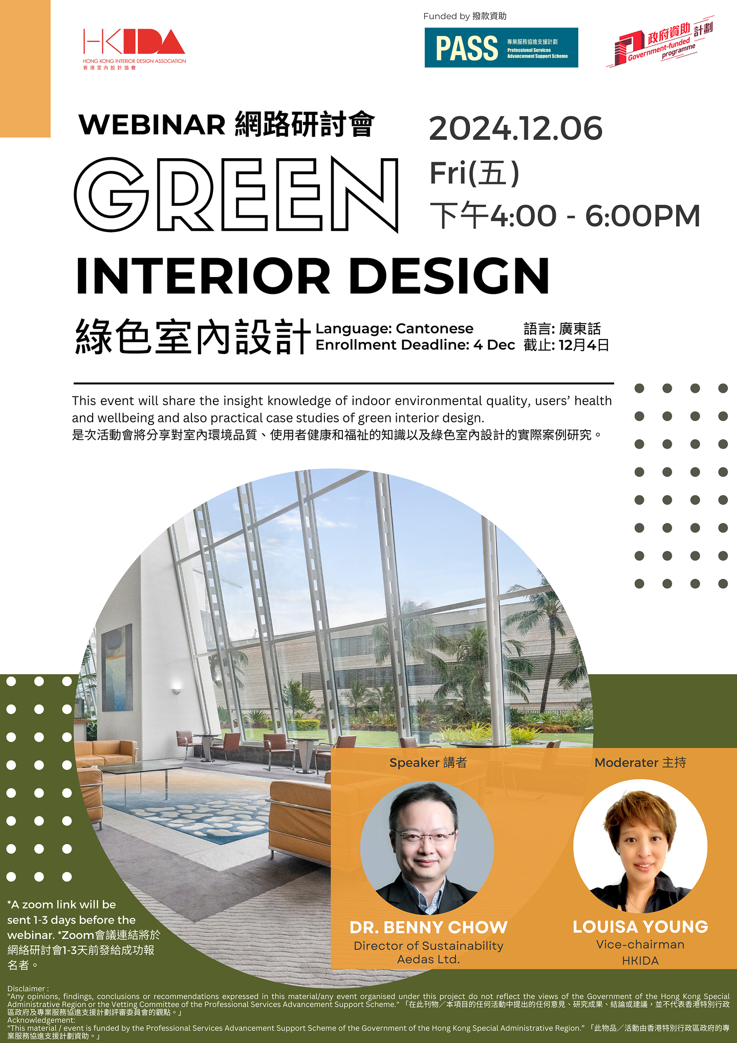 是次活動會將分享對室內環境品質、使用者健康和福祉的知識以及綠色室內設計的實際案例研究。